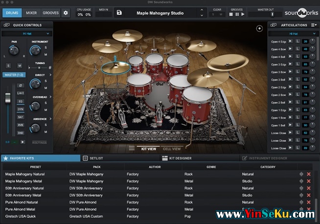 DW Soundworks 采样在源头采样,并在 DW 工厂录制,配备顶级麦克风、高品质麦克风前级放大器(麦克风前级)、多种压缩器和均衡器及其他工具,能够捕捉鼓声的真实音色,营造出真实的音频体验。核心音色库包含 DW Collector’s Series 系列的鼓组采样,包括 DW Pure Maple、DW Pure Almond、DW 50th Anniversary 和 DW Maple Mahogany 套件,以及 Gretsch USA 定制套件和 Don Lombardi 个人 1958 年 Slingerland 套件。DW Soundworks 的采样库将持续增长,随着您的声音演变,将推出新的扩展包以适应您不断变化的声音和口味。总体而言,DW Soundworks 是一款强大且用户友好的虚拟鼓软件,满足音乐人和制作人的需求。