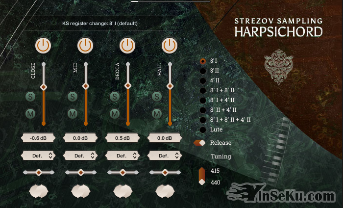 您可以选择使用此切换开关打开和关闭发布示例集。您还可以选择440Hz的现代调谐和415Hz的更传统的巴洛克式调谐。与我们的任何其他库一样,您有机会使用RESET RR和位于C1的按键开关重置任何仪器的轮回机制。