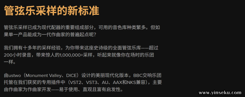 一样配乐 用终极的一体化管弦乐插件创作电影配乐——630GB,67种乐器,包括乐队和独奏者,在伦敦标志性的Maida Vale Studios以最细致的细节捕捉——这里曾是披头士、大卫·鲍伊和无数获奖电影配乐的举办地。