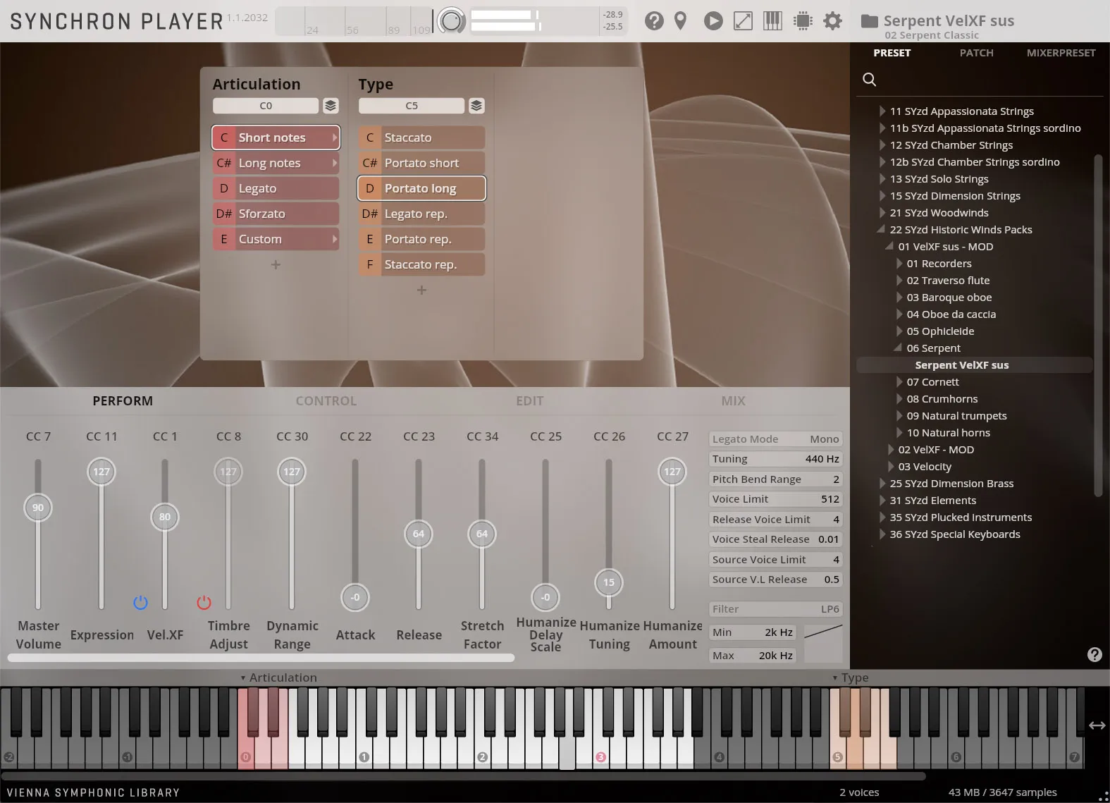 蛇(拉丁语:serpens,意为“蛇”)因其卓越的外观而易于辨认。该乐器于16世纪在法国发展,涵盖了zink(短号/短号)乐器家族的低音区。乐器在我们第二个录音室——Silent Stage相对干燥且受控的环境中录制,展现了所有典型的发音。