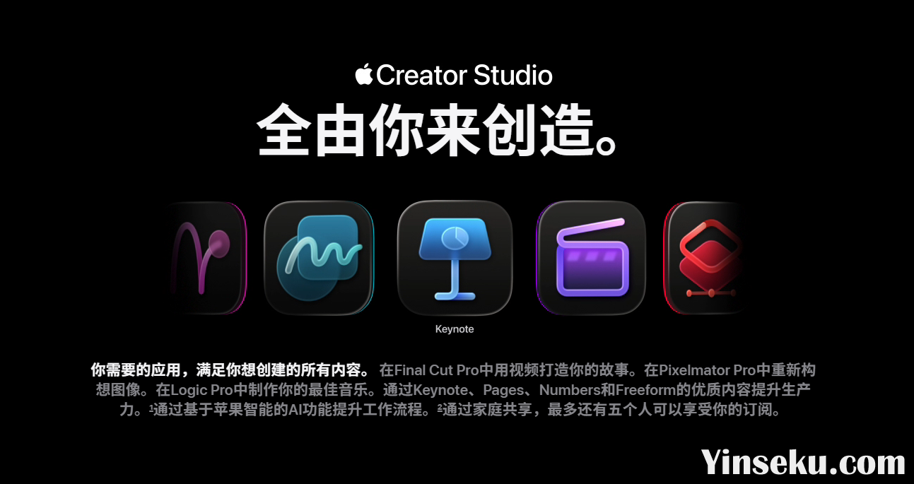 你需要的应用,满足你想创建的所有内容。在Final Cut Pro中用视频打造你的故事。在Pixelmator Pro中重新构想图像。在Logic Pro中创作你的最佳音乐。通过Keynote、Pages、Numbers和Freeform的优质内容提升生产力。1 利用基于Apple Intelligence的AI功能提升工作流程。2 通过家庭共享,最多五个人也能享受你的订阅。