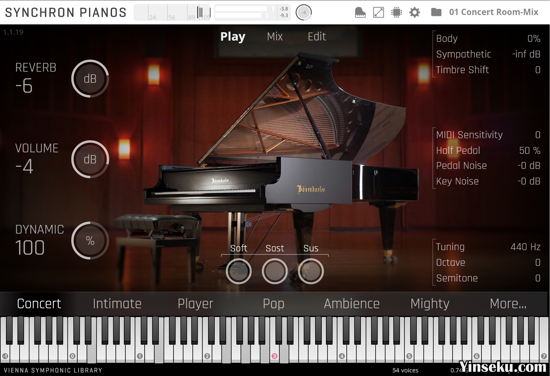 - 专有的Vienna Synchron钢琴发动机,具备可调节的共鸣共鸣、踏板噪音、键盘噪音等功能