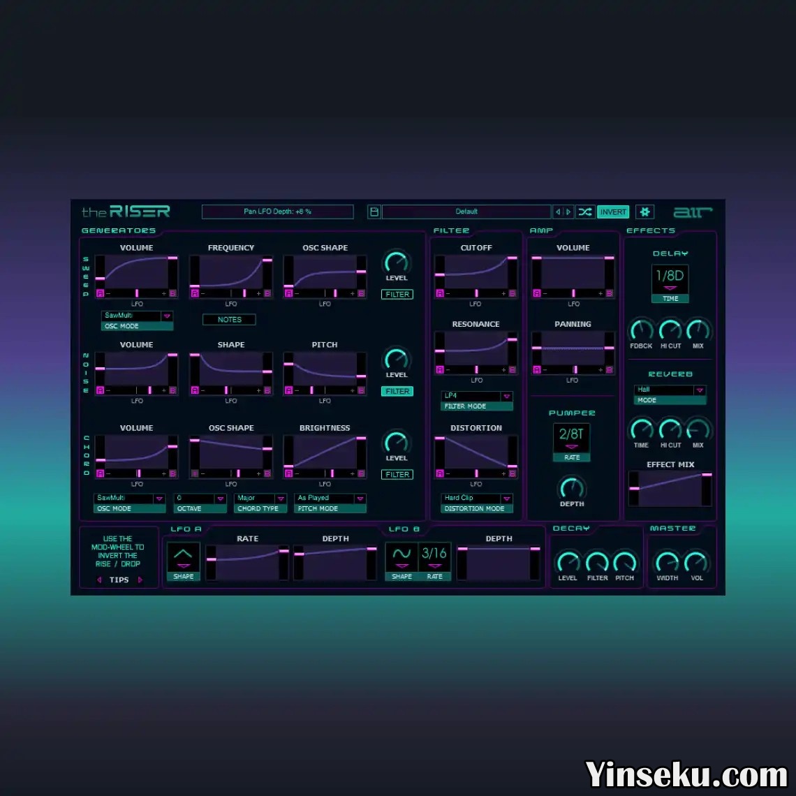 一 拥有最强大且富有音乐感的虚拟合成器,The Riser可用于创造人类耳朵从未听过的经典过渡或效果。The Riser的核心是三个连续可变振荡器;扫弦、噪音和和弦。每个振荡器都配备了专用的滤波器发送和图形参数表示。
