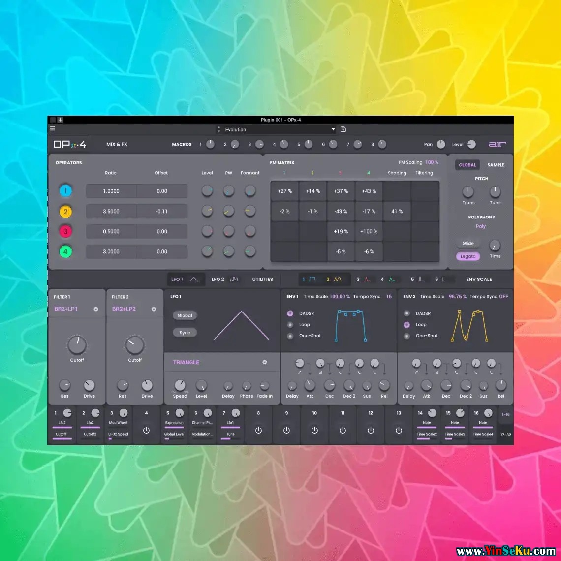 凭借灵活的波形塑造、23种不同滤波器的双模滤波路径、六个带节奏同步循环的包絡、两个LFO和两个斜坡,OPx-4将成为你首选的FM合成器。它包含三个插入效果器和两个全局效果,适用于27个包含的空气效果插件,如混响、延迟、失真、调制效果等。
