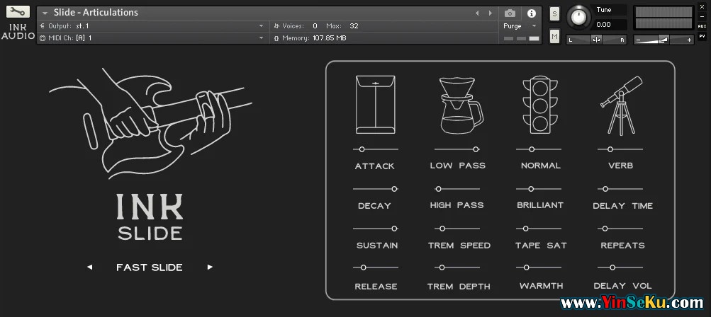 Ink Slide 是 Kontakt 的两部分滑棒吉他库,探索滑棒的柔和一面。该专辑采用玻璃滑管、颈拾音器、Boss CS-3接入1176压缩器录制。音色柔和,质感丰富,效果音很酷,和其他人搭配效果很好。