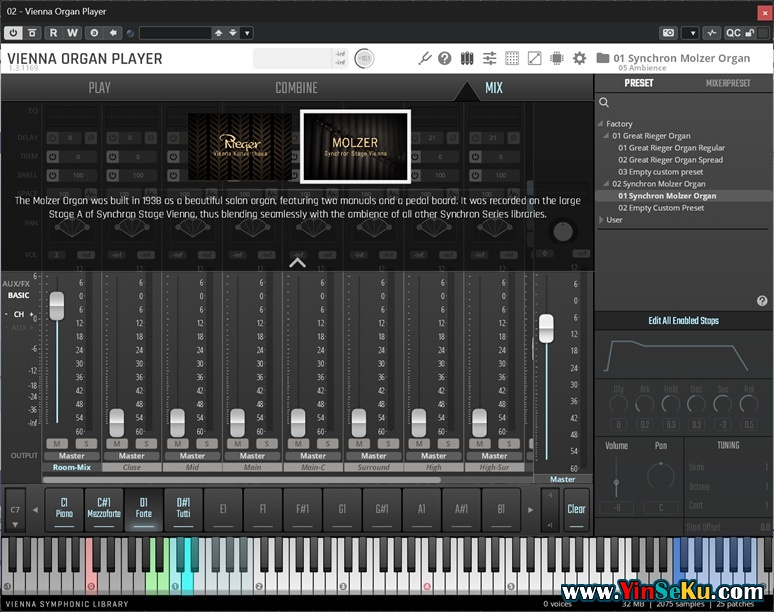演奏者引擎旨在管理风琴的手键盘和踏板,方便你轻松访问不同音栓,创建适合你音乐的音栓,并在MIDI风琴或常用MIDI键盘上演奏,使用键开关、程序切换或其他MIDI控制器来处理手册和变换组合。维也纳风琴播放器具备多音色功能,因此你可以通过专用的MIDI通道来处理手册和踏板。