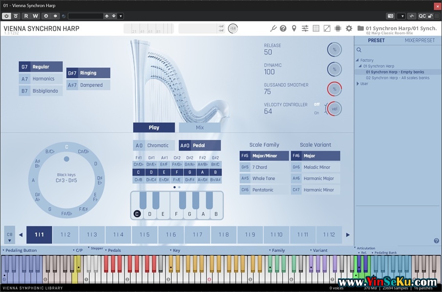 维也纳同步竖琴旨在管理竖琴的演奏可能性和踏板,以便不仅能轻松体验旋律/半音演奏,还能轻松体验竖琴标志性功能:滑音和琶音。你可以在任何常见的MIDI键盘上演奏竖琴(建议至少88个键),使用键开关、程序切换或其他MIDI控制器来调整不同设置和调性、踏板、滑音音阶及变体等。