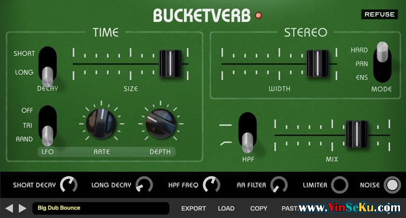 Bucketverb设想了一个另类历史,其中一块罕见的桶式延迟(BBD)芯片演变成了适合氛围、低保真衰减、人声存在等的复杂硬件单元。与标准单输出BBD延迟不同,模拟混响使用特殊的多重抽头BBD芯片来实现多个同时延迟时间。遗憾的是,这种效果只出现在少数产品中,随后被数字混响的兴起所取代。