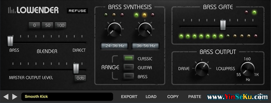 第三,低音器通过由过载电路和低通滤波器组成的输出部分。驱动或压缩新生成的低频对于平衡它们的动态至关重要,这样它们能很好地融入混音中。可变低通滤波器用于削减过载的高谐波,创造平滑的低频——或者你也可以保留部分低频,以获得更沙哑的低音。