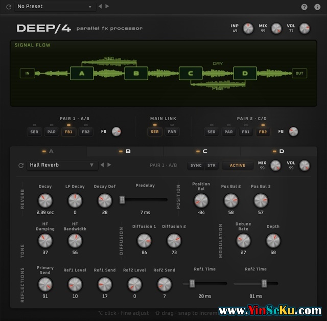 将四个单元串联运行以实现庞大的效果链,将其分割成平行路径以实现层叠纹理,或使用反馈路由创建不断演变的自调制音景。DEEP/4为每对(A/B和C/D)提供独立的路由控制,并配有主总线链路——支持串行、并行和两种反馈配置,反馈量可调。可用作单一4单元处理器、两对独立立体声,或四个独立效果器。
